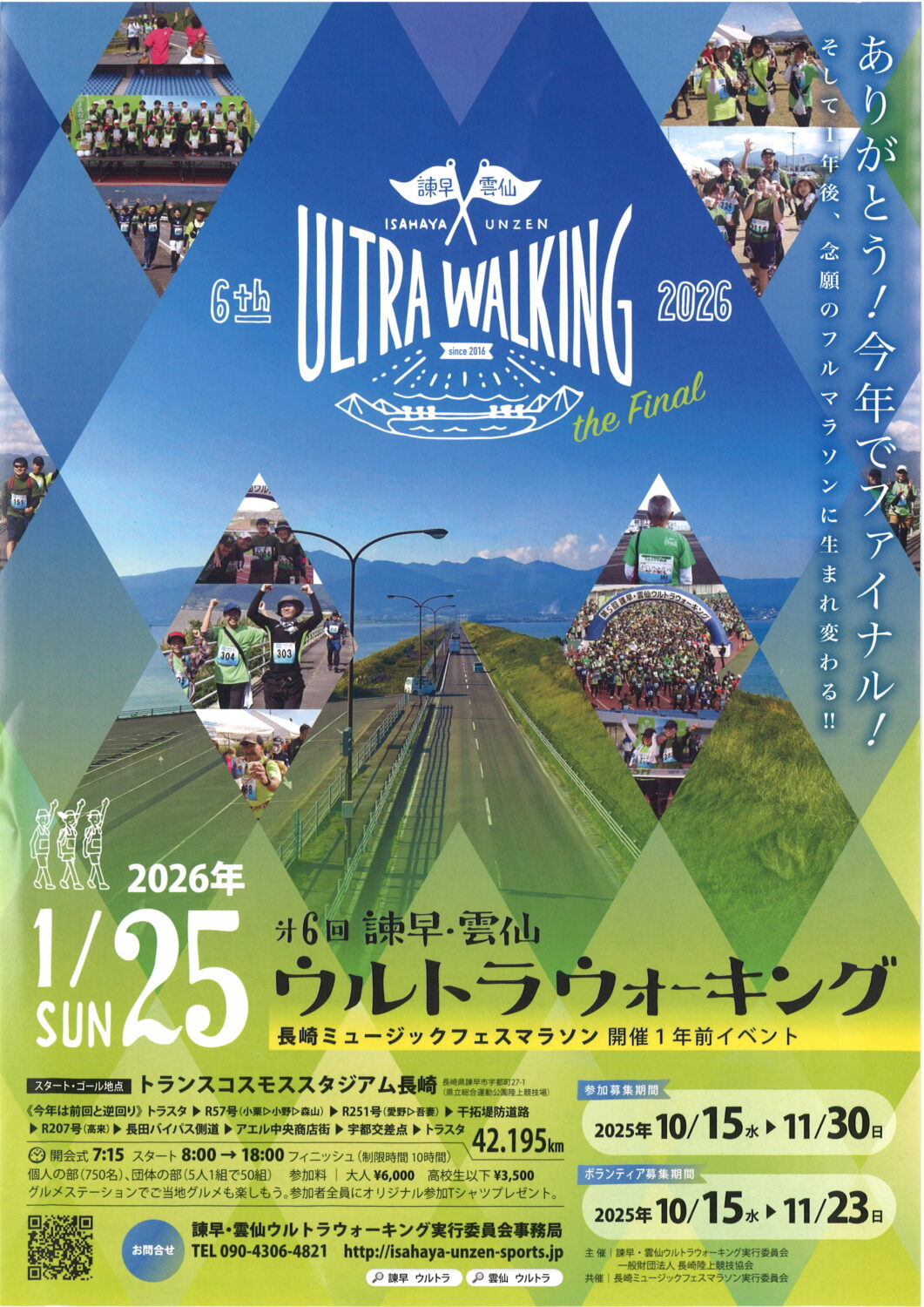 1/25(日) 第6回 ULTRA WALKING 2026 2026年1月13日 最終更新日時 : 2026年1月13日 aer-shoutengai_editor 今年でファイナルを迎えるウルトラウォーキングが1/25(日)に開催されます🎉1年後は『長崎ミュージックフェス・フルマラソン』へ!! 参加される皆さん頑張って下さいネ~✨