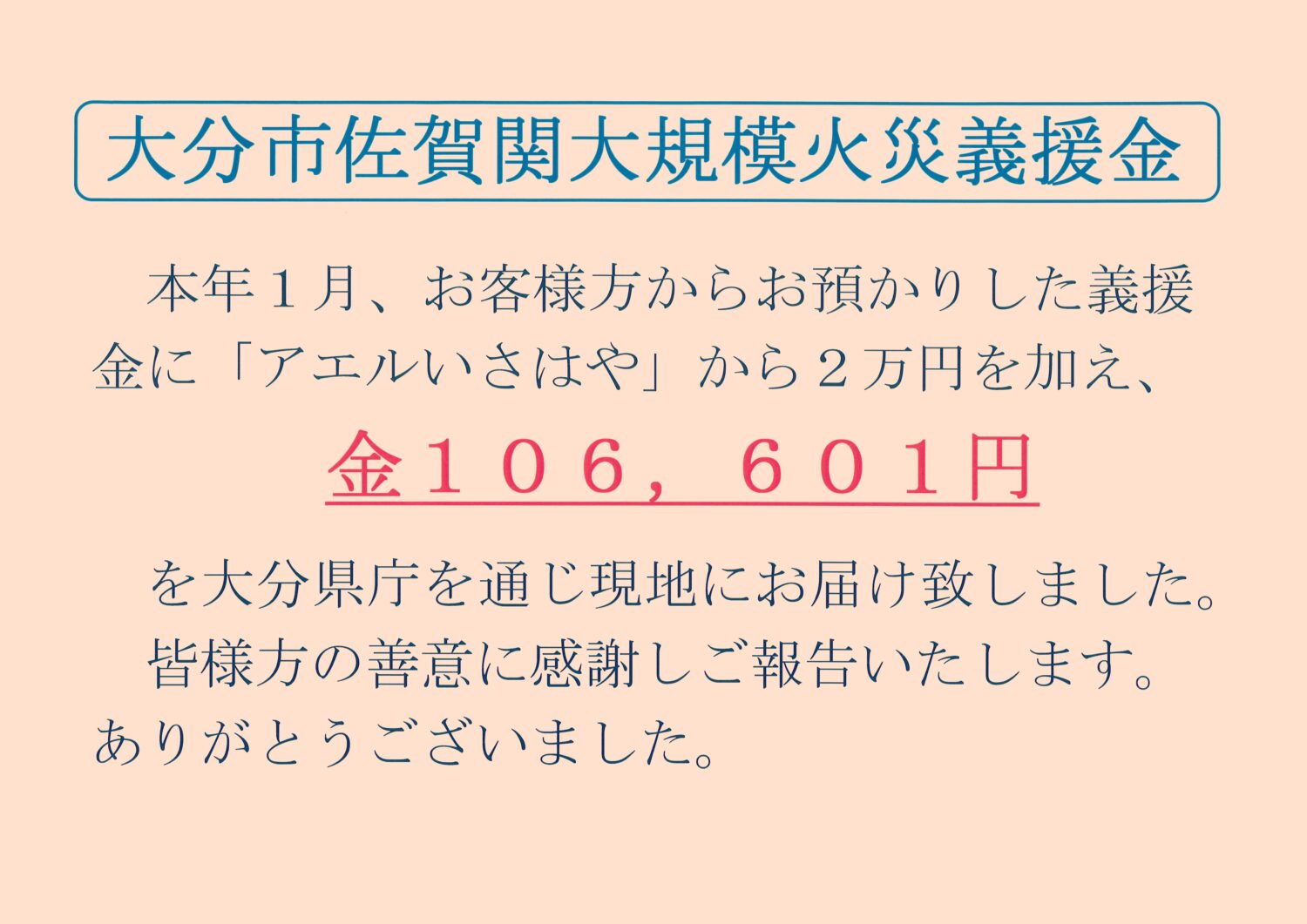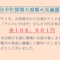《大分市佐賀関大規模火災義援金》にご協力頂いた皆様へ 2026年2月6日 最終更新日時 : 2026年2月9日 aer-shoutengai_editor 皆様からお預かりしました義援金は大分県庁を通して被災地へお届け致しました。皆様の真心の込もった善意に心より感謝申し上げます。 アエル中央商店街